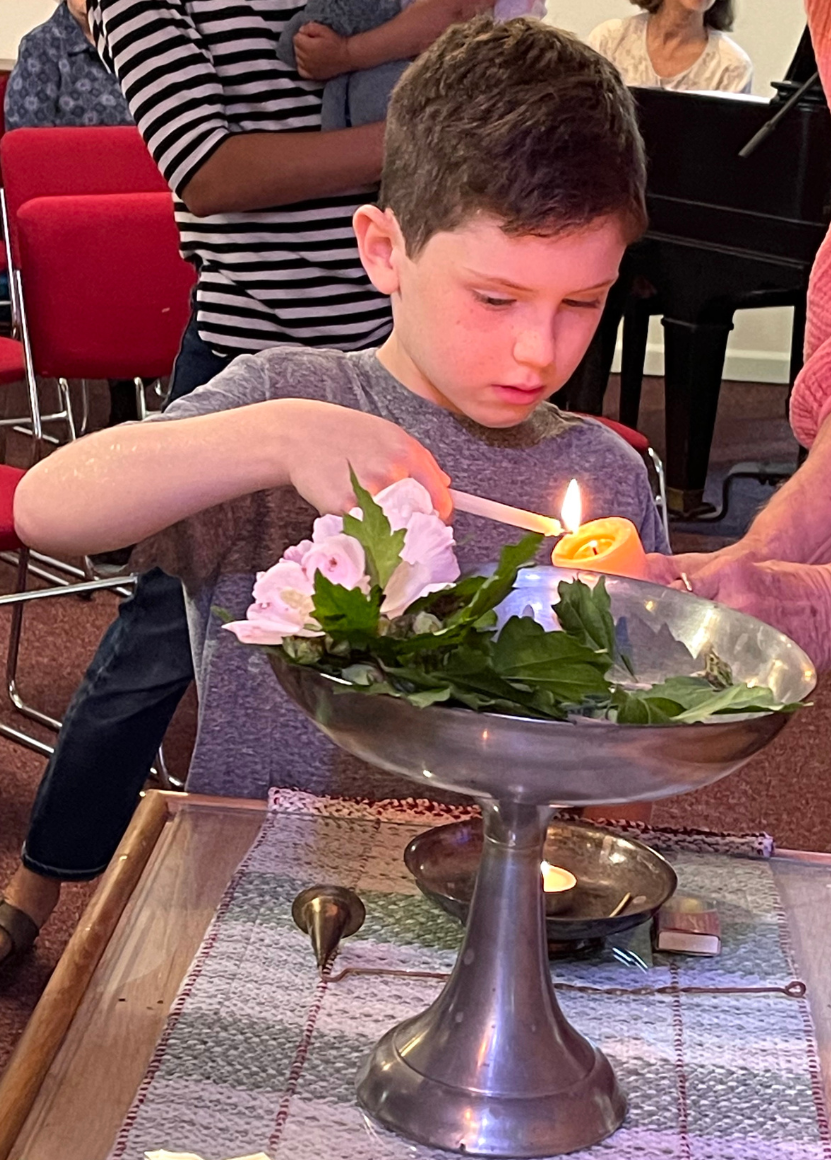 Our children (preschool and up) begin their Sunday morning experience with their families in the sanctuary, providing them with a sense of community, a feeling of at-oneness with each other and the world, an affirmation of what we believe and a feeling of inspiration. They take part in the chalice lighting, first hymn and remain present through "Not For Children Only" that addresses the sermon topic of the day in an age-appropriate way. They are then sung out of the sanctuary to their Religious Exploration (R.E.) session in our R.E. space.